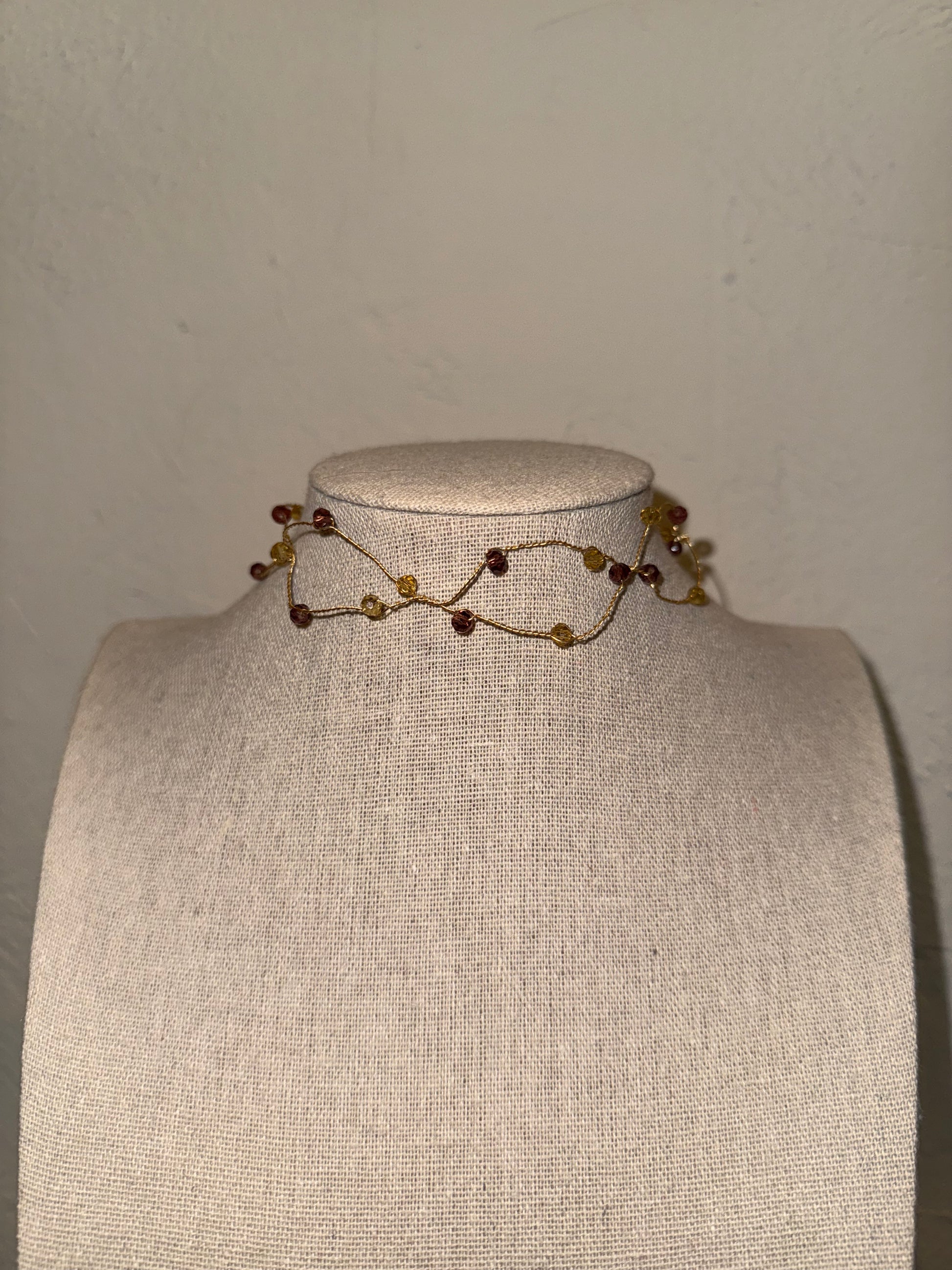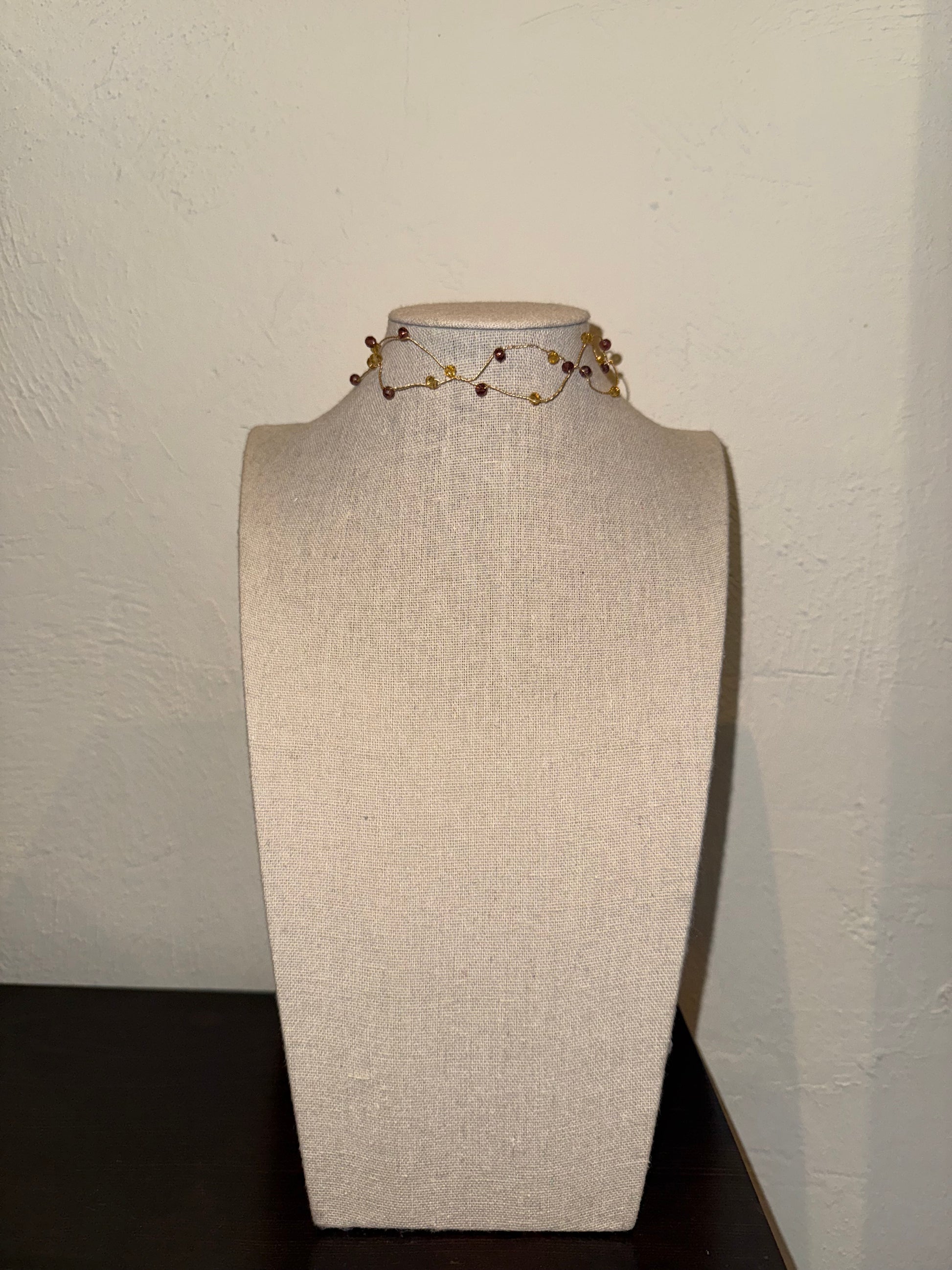 El Fortuna es un choker dorado decorado con bolitas blancas y moradas, un diseño elegante y versátil que se adapta a cualquier ocasión. Su estilo delicado lo convierte en el accesorio perfecto para aportar color y luminosidad a tus looks de otoño e invierno, además de ser una elección ideal para acompañar tus momentos más especiales.