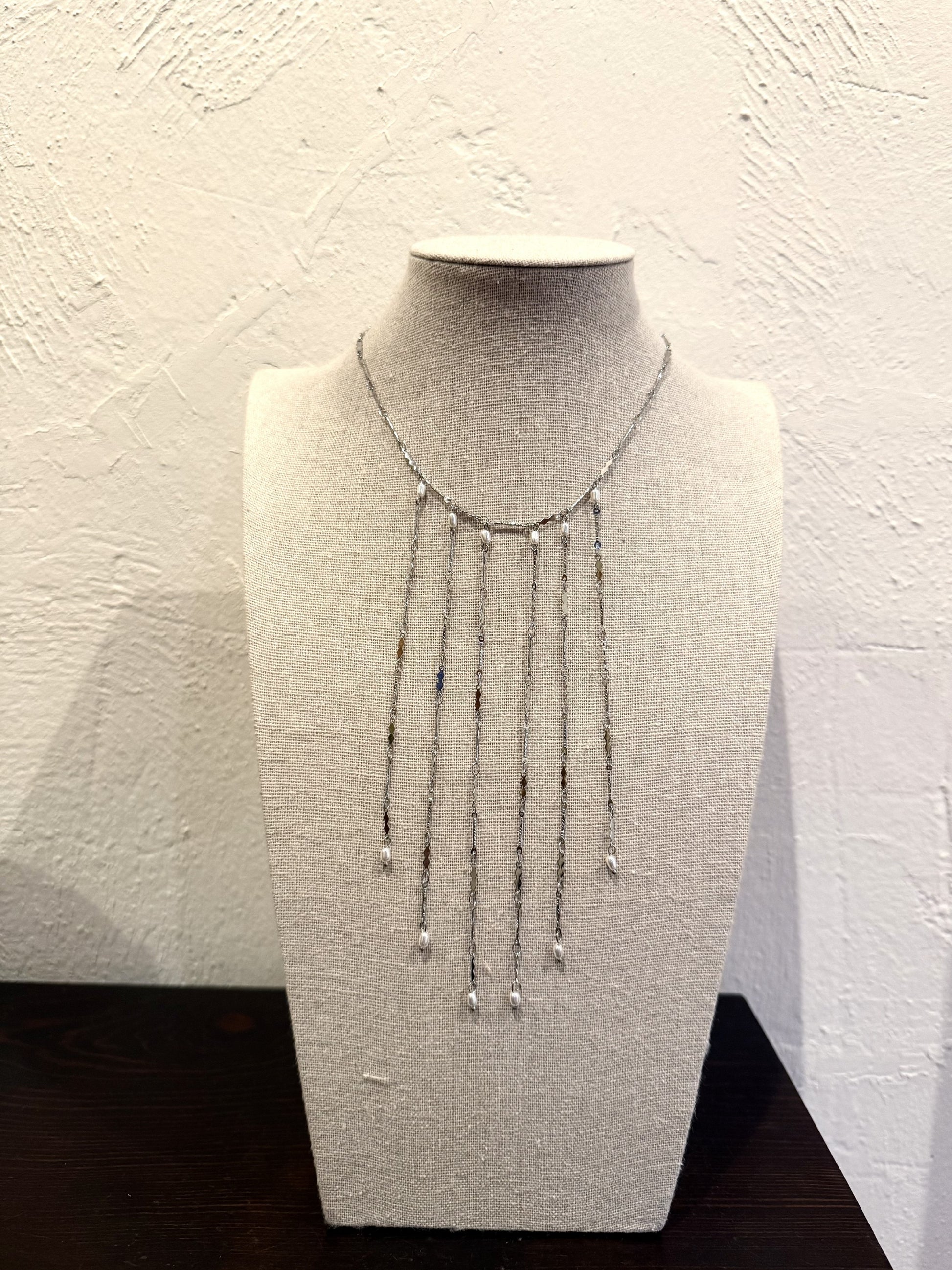 El Collar Luxor en plateado es una pieza que combina a la perfección modernidad y delicadeza. Su diseño en cascada, con varias hileras que caen suavemente alrededor del cuello, está adornado en cada hilo con perlitas blancas que aportan un toque sutil y luminoso.