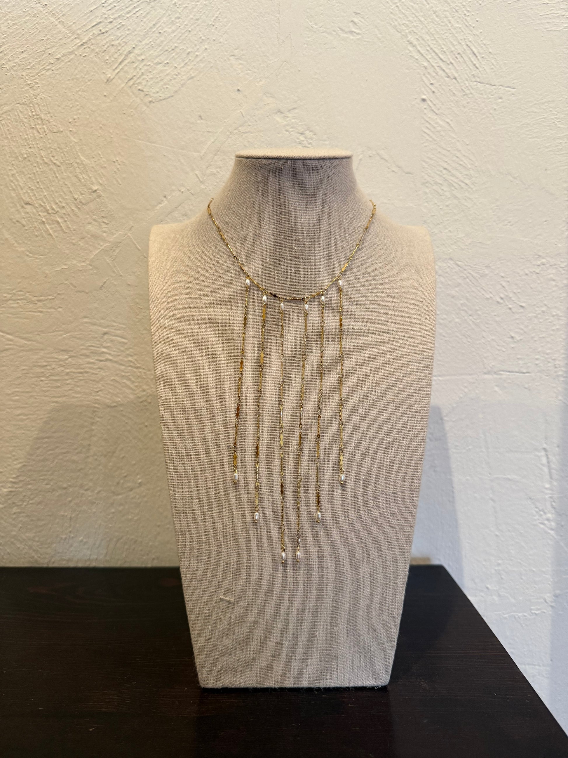 El Collar Luxor en dorado es una pieza que combina a la perfección modernidad y sofisticación. Su diseño en cascada, con varias hileras que caen suavemente alrededor del cuello, está adornado en cada hilo con perlitas blancas que aportan un contraste radiante y elegante.