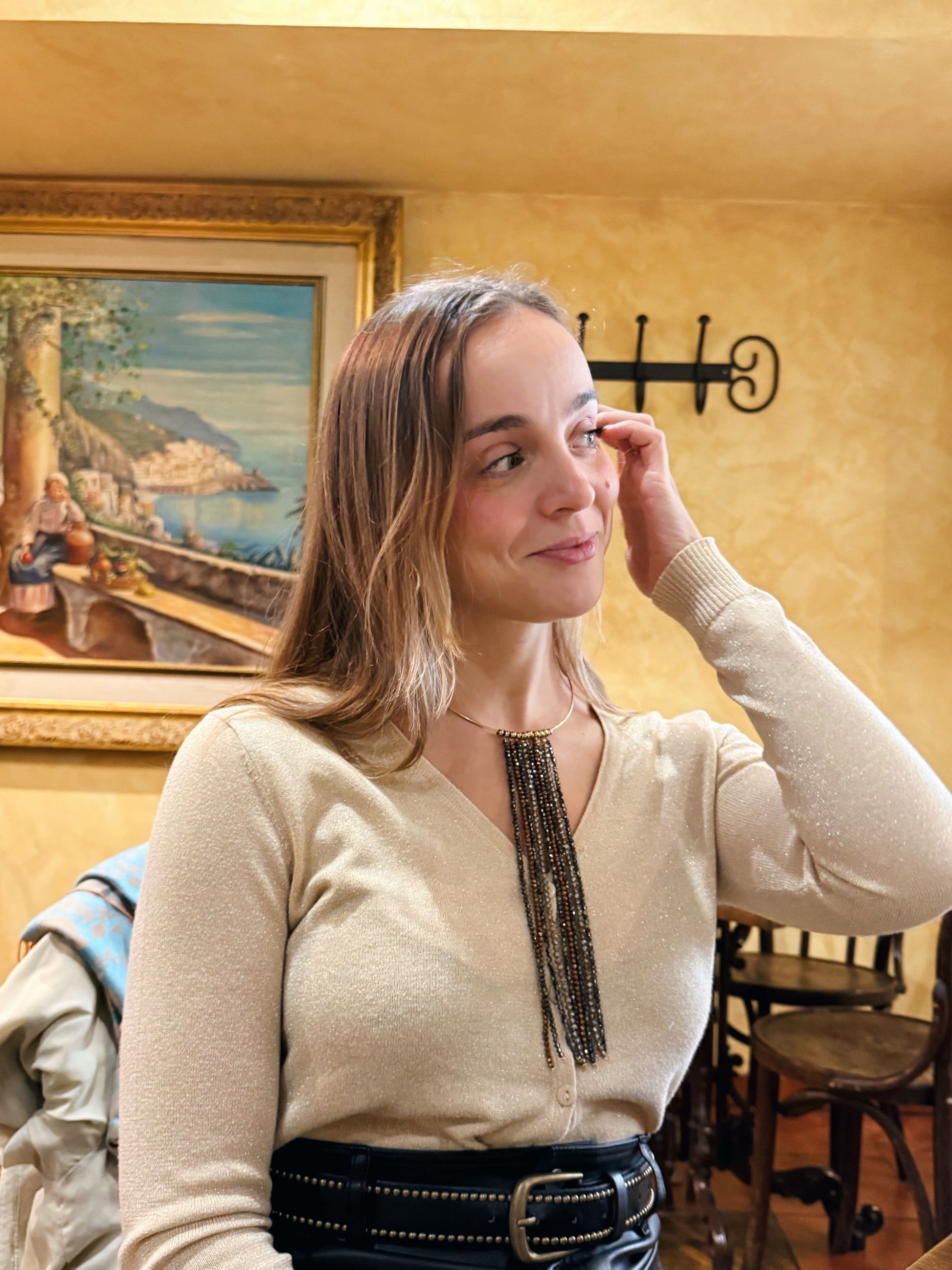 Inspirado en la diosa del cielo estrellado, el collar Nut es una pieza que captura la magia de la noche y los colores del otoño. Su diseño en forma de cascada deja caer delicadas bolitas brillantes en tonos marrones, naranjas, negros y grises, evocando la calidez de la estación y la profundidad del firmamento.